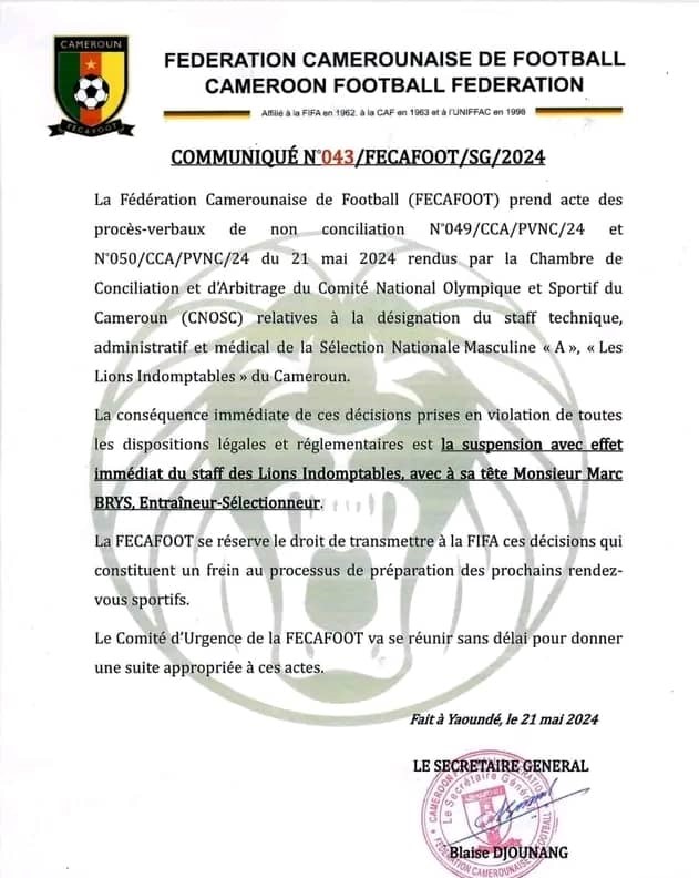 La conflit de compétence opposant le ministère camerounais des Sports et de l’Education physique (Minsep) à la Fédération camerounaise de football (Fecafoot) depuis le 2 avril 2024, au sujet de la désignation des membres de l’encadrement de l’équipe nationale de football fanion, joue désormais les prolongations dans les instances arbitrales du sports, sans que les Lions indomptables ne soient rassurés qu’ils vont participer aux premiers matches éliminatoires comptant pour la prochaine coupe du monde. Les choses sont allées très vite le 21 mai 2024. La Chambre de conciliation et d’arbitrage (Cca) du Comité national olympique et sportif du Cameroun (Cnosc), présidée par Nadine Machikou Ngameni rend un procès-verbal de non conciliation contenant mesures conservatoires, qui ordonne la suspension immédiate des effets des résolutions de la session du Comité d’urgence de la Fecafoot du 8 mai 2024 relatives à la nomination des membres de la structure d’encadrement des Lions indomptables, et de la décision de la Fecafoot portant nomination de ce staff.